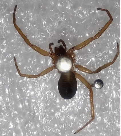 La identificación es clave: su cuerpo, o caparazón, es de un marrón oscuro y brillante, mientras que su abdomen a menudo presenta un patrón de manchas negras con puntos dorados o plateados. Un rasgo distintivo son sus patas anilladas, que le dan una apariencia rayada y la distinguen de otras arañas enanas.
